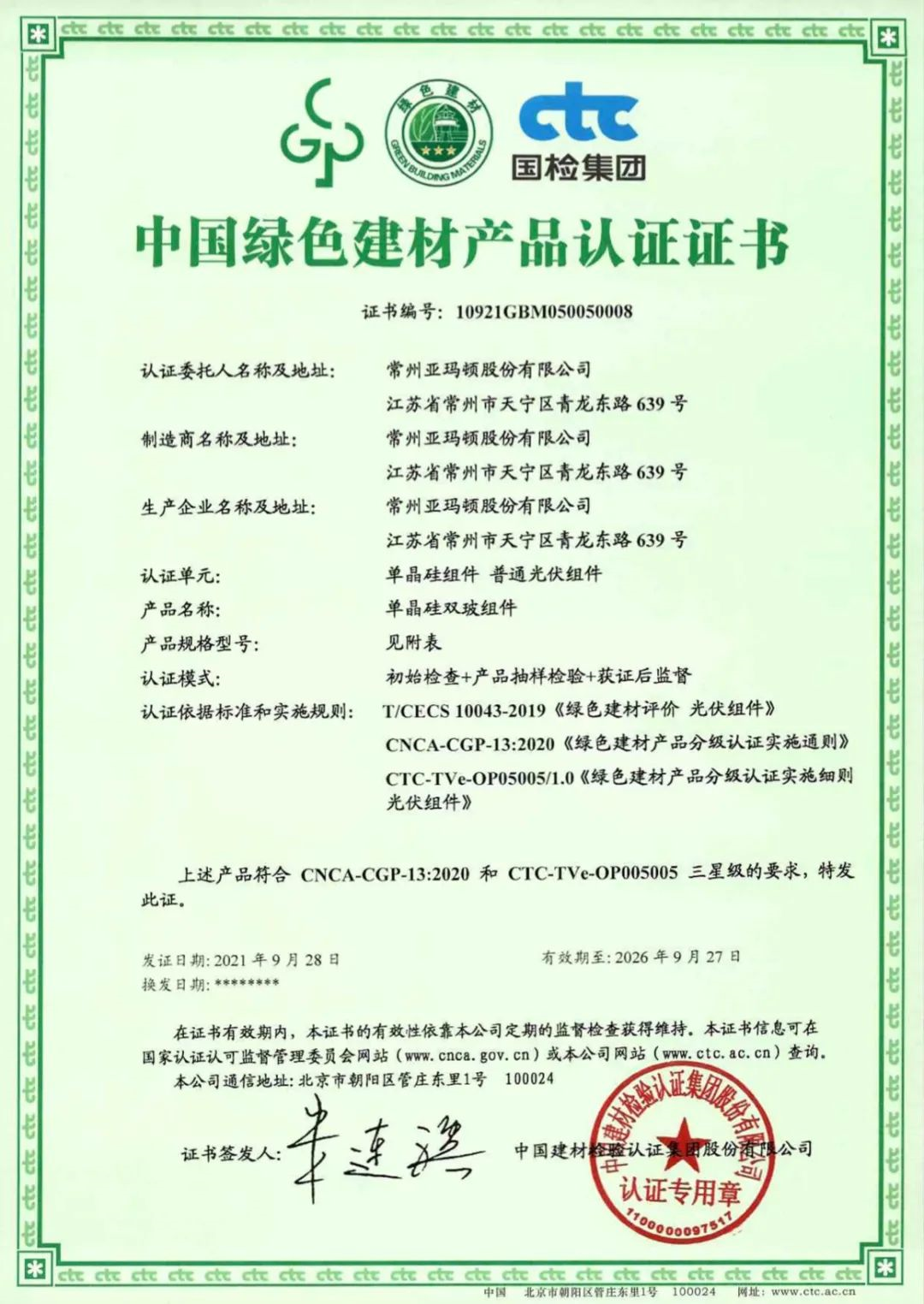 近日,常州亞瑪頓股份有限公司的單晶硅雙玻組件順利通過中國國檢測試控…