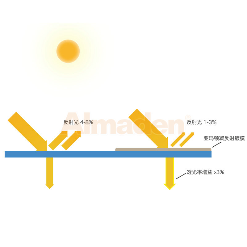 亞瑪頓減反射鍍膜涂層能夠使寬光譜范圍內的玻璃透光率增加3%以上,使組件的平均功率增益達到5~8瓦,提高組件發電效率。